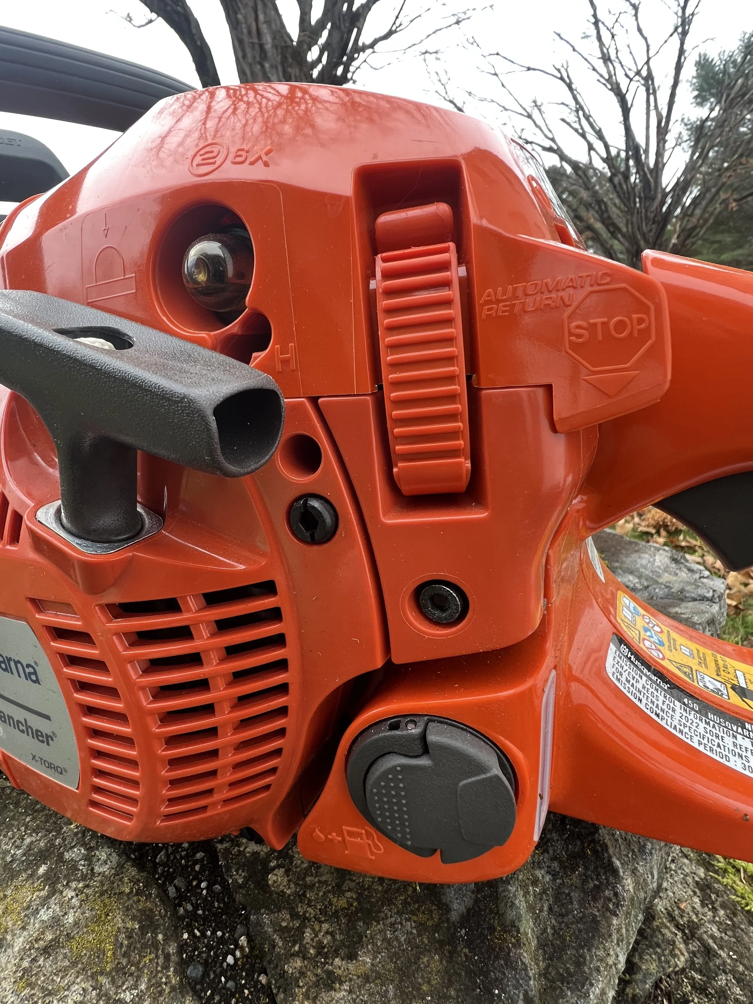 One of the biggest surprises was how intuitive this saw feels. The choke, primer bulb, and on/off switch are all right where you want them. Numbered starting instructions are molded right onto the plastic case. Cold starts are straightforward: two pulls on full choke, one more after flipping it down, and it’s running. Warm restarts are almost instant.